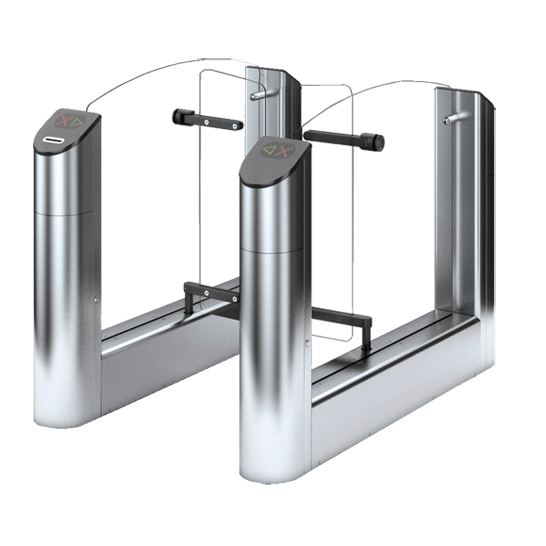 Корпус турникета выполнен из шлифованной нержавеющей стали. Преграждающие створки выполнены из закаленного стекла (1 стеклянная дверца с электроприводом).